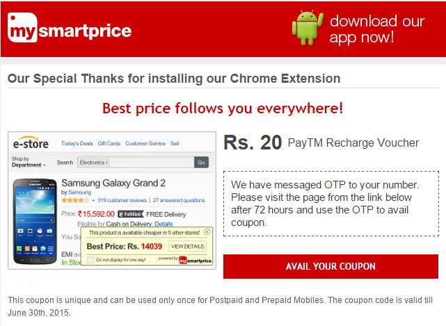 Just click on “ADD TO CHROME” button to download and install the extension. After successful download and installing it to the Google Chrome browser you will see the pop up on the same website asking you to enter your Email address. So just input your email and click on “GET PAYTM VOUCHER” button. That's it.. Though i can't reply to all for same questions asking again and again. ... To add Coupons in Paytm first we need their app so go to app store and search Paytm and download it. ... After that install it and do sign up there if you don't have account by ... Junglee Recharge Post Ad to get Free 20 Rs by Amul.. ... get 10 Rs in wallet. Use this link to pay 5 Rs and get total 10 rupees back in your paytm wallet. ... from MySmartPrice. Open Google Chrome browser in your desktop and visit this link. Now install mysmartprice plugin to get free paytm voucher worth 20 Rs. ... Bharat says: Dear Admin, FREE25 for new users is not working.